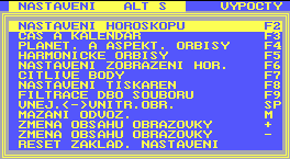 Veškeré dialogové panely pro nastavení horoskopu nalezneme po rozbalení prvního menu vodorovné modré hlavní lišty (hlavního menu) NASTAVENÍ (případně stisk kombinace kláves <ALT><S>). Po rozbalení dostaneme tyto nabídky: