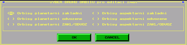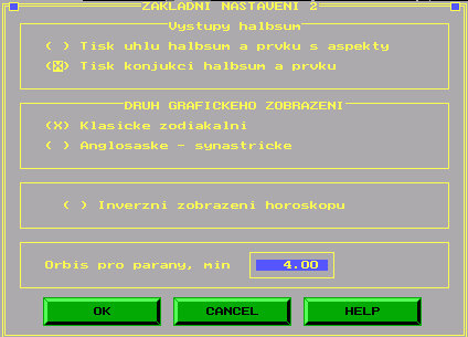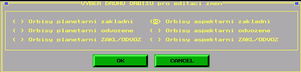 Opět rozbalíme hlavní menu NASTAVENÍ. Tentokrát se budeme věnovat aspektárním orbisům, což jsou dovolené odchylky aspektů - úhlových vzdáleností mezi prvky horoskopu. Jak již víme, aspekty málokdy nalezneme přesné. Najedeme na položku ASPEKTÁRNÍ ORBISY - základní, odvozené, základní/odvozené (nebo stiskneme F4)