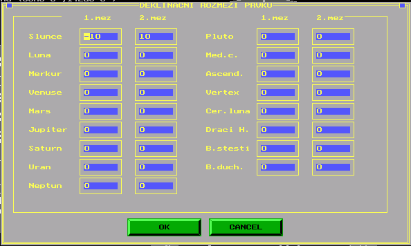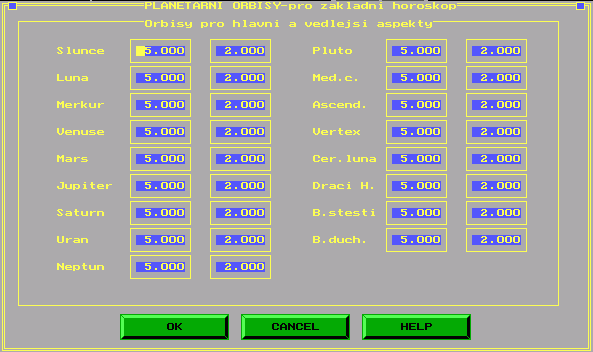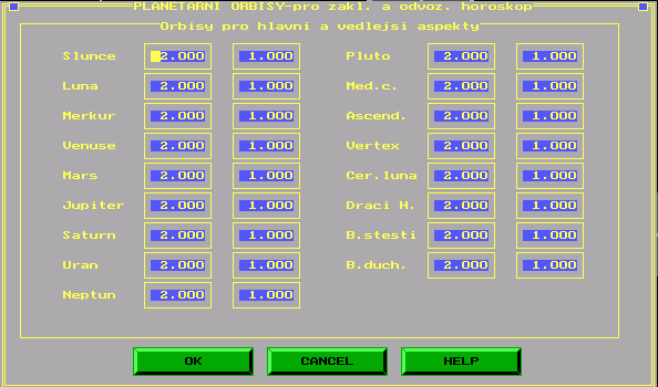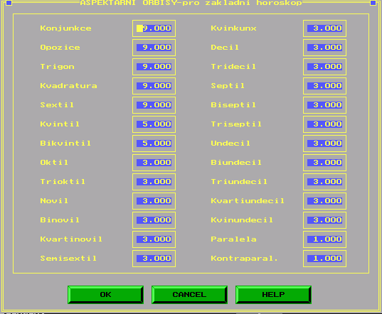 I zde lze nastavit orbisy v rozsahu 0,001° - 20°. Začátečníkům doporučujeme nepřekračovat následující hodnoty orbisů u základního i odvozeného horoskopu.