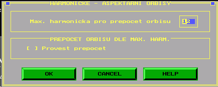 a otevře se na obrazovce panel harmonické - aspektární orbisy. Pokud chceme nastavit orbisy podle harmonických řad (12. - 180.), zapíšeme hodnotu nejvyšší harmonické a pokud chceme orbisy nechat přepočítat podle harmonické tak, aby orbis pro každý aspekt byl s touto nejvyšší harmonickou konfrontován, zaškrtneme Provést přepočet.