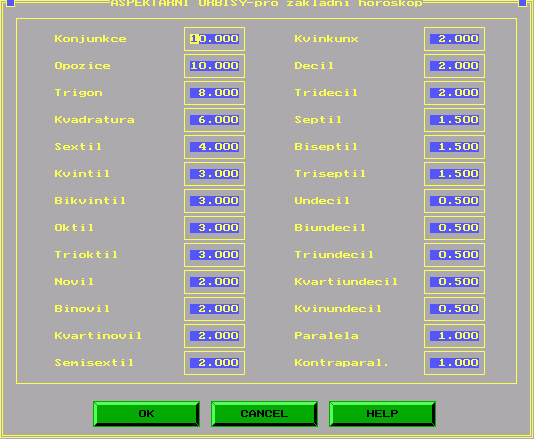 Při nastavení orbisu na 0° se daný aspekt nevypisuje v tabulce aspektů.