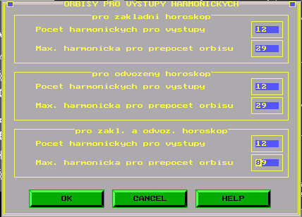 Opět rozbalíme hlavní menu NASTAVENÍ. Tentokrát můžeme zvolit HARMONICKÉ ORBISY, nebo stisknout F5 a dostaneme panel Orbisy pro výstup harmonických pro horoskop základní, odvozený a vztah mezi horoskopem základním a odvozeným. Ve všech případech můžeme zvolit počet harmonických pro výstup a maximální harmonickou pro přepočet orbisů. Tyto volby ovlivní podobu tabulek výstupů.