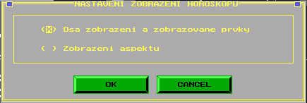 Nejprve zvolíme OSU ZOBRAZENÍ A ZOBRAZOVANÉ PRVKY, poté se nám otevře NASTAVENÍ ZOBRAZENÍ. V horním bloku (Vodorovná osa zobrazení) nastavujeme levou stranu horizontály, podle níž bude horoskop zobrazen. Sem je možné dosadit kterýkoliv prvek z uvedených. Program je implicitně nastaven na zobrazení podle horizontály Ascendent (levá strana) - Descendent (pravá strana). V dolním bloku (Výběr zobrazovaných prvků) můžeme zvolit nebo naopak zrušit prvky, které v horoskopickém kruhu a aspektáriu potřebujeme vidět, a které naopak skrýt.