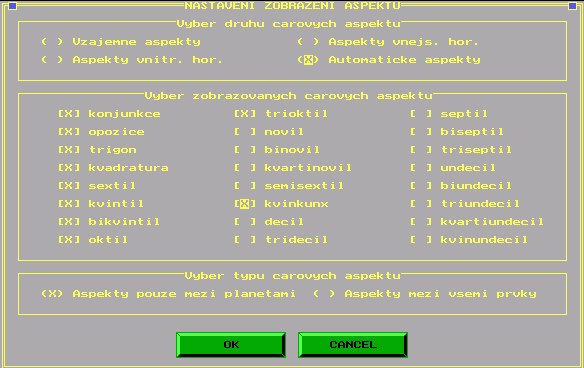Konečně poslední položka Automatické aspekty má za následek zobrazení čarových aspektů vnitřního horoskopu, pokud bude na obrazovce jen jeden (čili vnitřní) horoskop. V okamžiku, kdy se na obrazovce objeví i vnější - odvozený horoskop, budou zobrazeny čarové aspekty, spojující prvky vnitřního a vnějšího horoskopu (např. mezi nativitou a tranzitním horoskopem), tak jako v prvním případě u vzájemných aspektů.