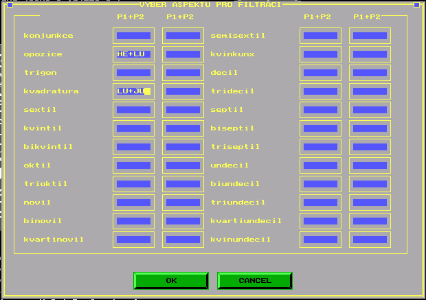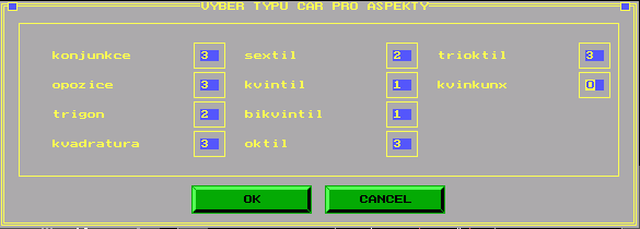 Další část tabulky Výběr typu čar pro aspekty nám umožňuje zvolit aspekty, které chceme na obrazovce i na vytištěném výsledku vidět. Alespoň jeden z aspektů musí být zaškrtnut. V případě, že nechceme zobrazovat žádné aspekty, zaškrtneme v panelu 14 pouze konjunkci.