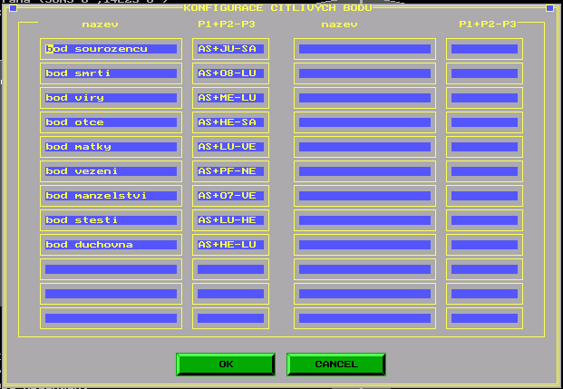 Nabídka citlivé body nebo F7 nám umožní nakonfigurovat 24 dalších citlivých bodů. Bod štěstí a bod duchovní jsou v nabídce stabilně. Konfiguraci provádíme například tak, že k prvnímu prvku (P1) příčteme druhý prvek (P2) a třetí prvek (P3) odečteme. Používáme stejné zkratky, které najdeme ve výstupech: pro Slunce HE (Helios), Lunu LU, Medium Coeli MC atd, pro hroty domů 01 - 12.