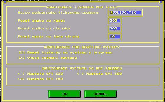 Zvolíme tu, která nám vyhovuje a potvrdíme entrem a otevře se panel KONFIGURACE TISKÁREN PRO TEXTY, kde neupravujeme zpravidla nic a pokračujeme na KONFIGURACE PRO GRAFICKÉ VÝSTUPY, kde můžeme zvolit zda chceme mít ve vytištěném horoskopickém formuláři rastrem zdůrazněna pole kladných znamení. Dále můžeme zvolit hustotu DPI pro horoskopické formuláře ukládané jako .BMP formát. Doporučujeme zvolit hustotu 150 DPI. Další podrobnosti o TISKU nalezneme v příslušné kapitole.