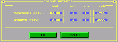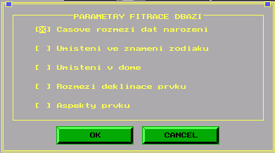 FILTRACE DBO (databázových) SOUBORŮ (vyvoláno rovněž klávesou F9) nám umožní volit podle různých kritérií soubory z databází osob, které si během doby vytvoříme. Příponou .DBO musí jméno souboru končit v každém případě. Vyvolaný dialogový panel nám umožňuje určit různé kombinace následujících voleb.