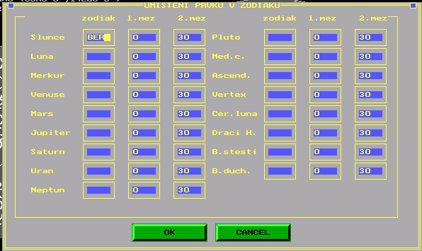 Umístění jednoho nebo více prvků současně v znameních zodiaku a to bud´ v celém znamení, nebo v jeho zlomku, od 0° do 30°, jména znamení zadáváme prvními třemi písmeny (BER apod.)