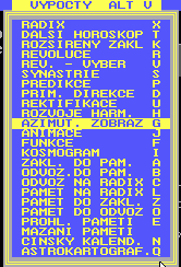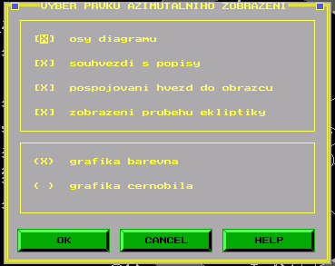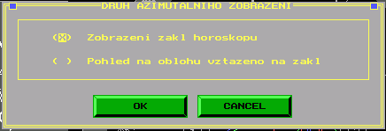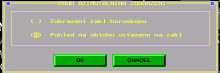 Po zvolení Azimutálního zobrazení (kombinace kláves <SHIFT><G>) opět dostaneme na monitoru panel DRUH AZIMUTÁLNÍHO ZOBRAZENÍ pro příslušná zadání požadovaného zobrazení.