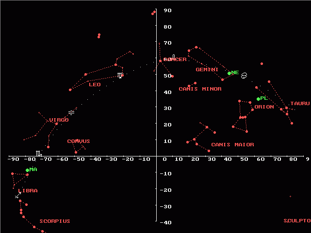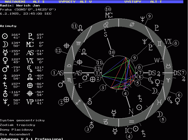 Pokud stiskneme mezerník, uvidíme azimutální zobrazení uvnitř kruhu a vlevo místo poloh v zodiaku spatříme údaje o poloze prvků horoskopu v azimutálních souřadnicích
