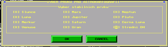 nebo kombinacemi kláves <SHIFT><Q>. V následujícím panelu VÝBĚR PRVKU PRO ASTROKARTOGRAFII zvolíme ty prvky radixu, základního horoskopu, které chceme vidět zobrazeny, doporučujeme zvolit zejména všechny planety od Slunce po Plutona a prvky jako v našem instruktážním případě.