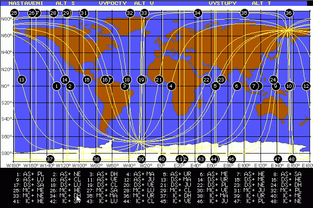 Potvrdíme a vyčkáme, až se na obrazovce objeví mapa světa se souřadnicovým systémem (N = sever, S = jih, W = západ, E = východ) a s očíslovanými liniemi. Sinusoidy, číslované v rovníkové oblasti, představují místa, kde v daném okamžiku planety a prvky vycházejí (jsou v konjunci s ascendentem), respektive zapadají (jsou v konjunkci s descendentem). Místa, kde se linie kříží, jsou nanejvýš významná a kombinují vliv zúčastněných prvků, jsou to paranatellonta, nebo parany, které známe z tabulky Východů, kulminací a západů těles. Pokud se čísla překrývají, měly by být pod viditelným číslem čísla následující v pořadí. Vertikály číslované nahoře představují místa, kde planety a prvky kulminují nahoře (přesněji jsou v konjunkci s mediem coeli), vertikály číslované dole představují místa, kde planety a prvky kulminují dole, (přesněji jsou v konjunkci s immem coeli). Pod mapou světa nalezneme vysvětlivky ukazující která linie představuje vztah těch kterých prvků. Pokud jsme zvolili celou nabídku 12 planet a prvků, měly by vysvětlivky obsahovat 48 položek. K astrokartografické mapě se můžeme pomocí kláves +, - vracet dokud nezměníme radix, nebo základní horoskop.